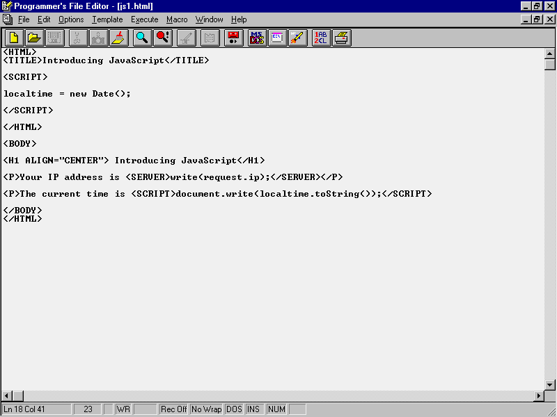As was mentioned previously, the code for JavaScript programs is embedded directly into Web pages. To accommodate the inclusion of JavaScript programs in a normal HTML document, Netscape has introduced two new tags, the <SCRIPT> tag for client side code, and the <SERVER> tag for server side code.