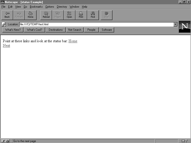 <HTML> <HEAD> <TITLE>status Example</TITLE> </HEAD> <BODY> Point at these links and look at the status bar: <A HREF="home.html" onMouseover="self.status='Go back home ...'; return true">Home</A><BR> <A HREF="next.html" onMouseover="self.status='Go to the next page'; return true">Next</A> </BODY> </HTML>
