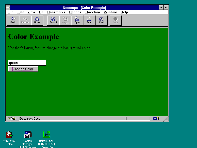 <HTML> <HEAD> <TITLE>Color Example</TITLE> </HEAD> <BODY BGCOLOR="#FFFFFF"> <H1>Color Example</H1> Use the following form to change the background color: <BR> <FORM> <INPUT TYPE=text NAME="color"> <BR> <INPUT TYPE=button VALUE="Change Color" onClick="document.bgColor=this.form.color.value"> </FORM> </BODY> </HTML>