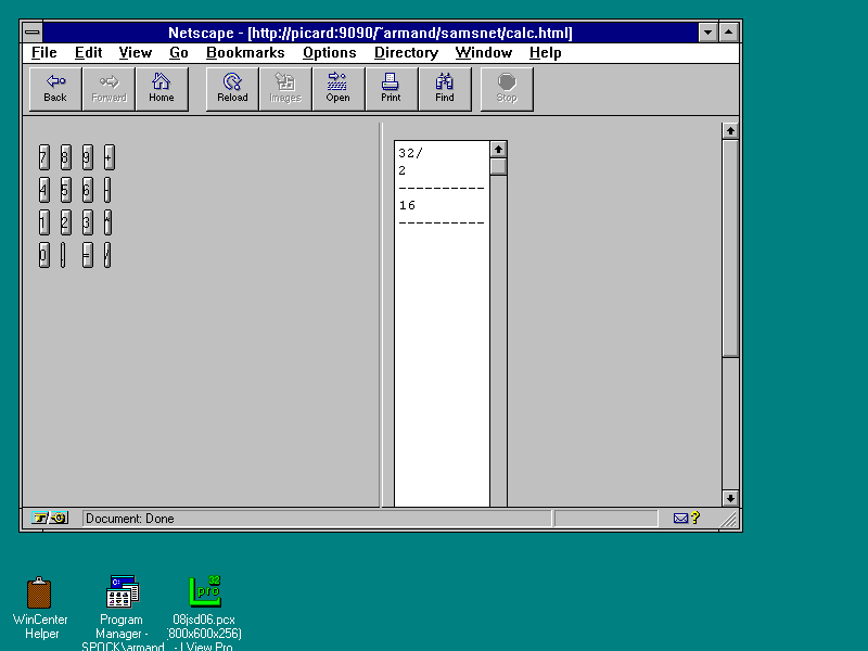 This example demonstrates the basics of cross-frame communication. Although all the logic in the program is in the left-hand frame (control.html), the output occurs in the right-hand frame. In addition, all data for the calculator is stored in hidden fields in the form in the right-hand frame (output.html).
