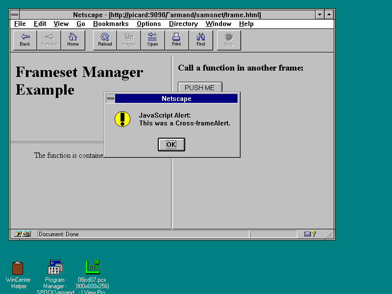 To demonstrate how the frameset manager works, the following example divides the window into three frames: A button in the right-hand frame calls a function in the bottom-left frame, which displays an alert dialog box.