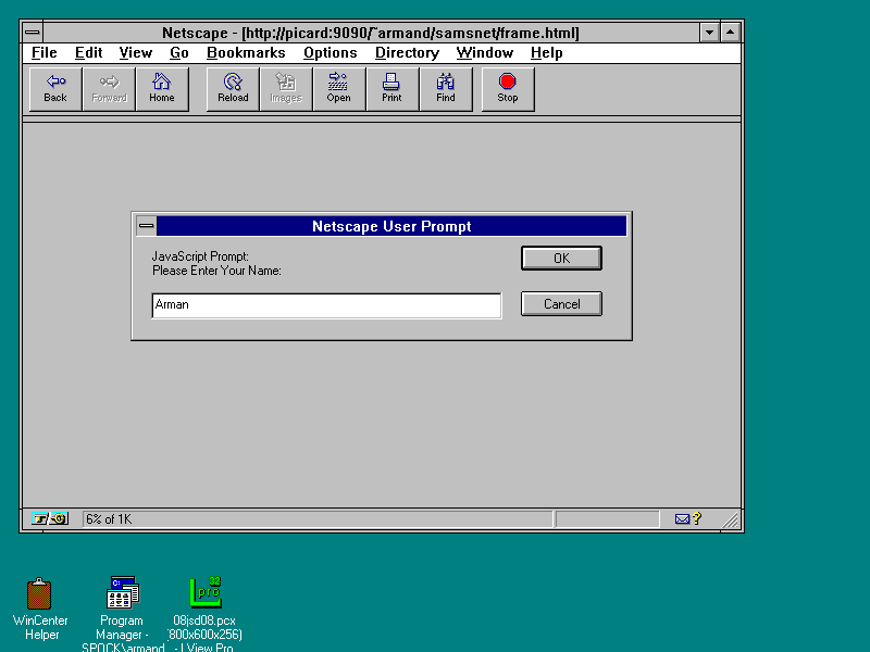 The script in the header of the document also contains some initialization code that executes before the body of the document is parsed and rendered. This code calls getCookie() looking for a Cookie named UserName. If there is no Cookie with that name, then the user is prompted for his or her name. The value contained in userName (either from the Cookie or from the user) is written back to the Cookie UserNameensuring that even if the Cookie existed, the expiry date is updated to be one year from the current date.
