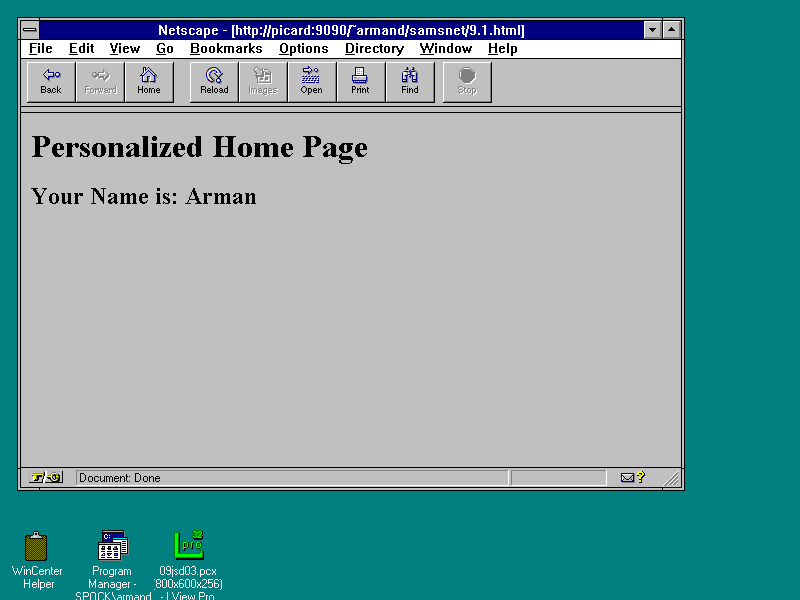 The following simple personalized Web page illustrates the techniques for working with Cookies in JavaScript. If a user comes to the page for the first time or after the relevant Cookie has been deleted, they are prompted for their name. On future visits the user is welcomed personally without any prompting for their name: