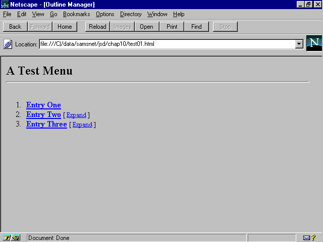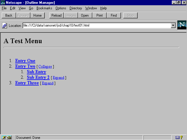 After toprint is displayed, a for loop is used to run through the section property (which is an array of objects for each sub entry) and calls those objects' display() methods in turn. Notice that the for loop is surrounded by two document.write() calls that output <UL> and </UL>. This makes the sub menu entries into nested unnumbered lists, which Netscape indents further than the current level, as shown in Figure 10.4.