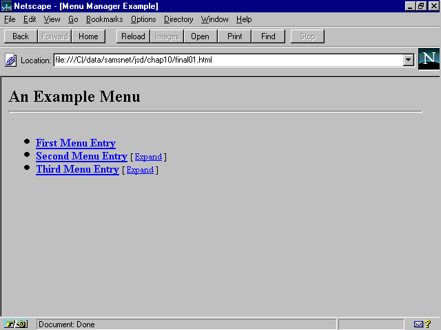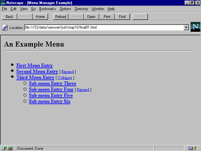 The menu manager developed in this chapter is designed to enable Web authors to implement collapsible hierarchical menus similar to the system used to display directory structures in Windows 95's Explorer or Windows 3.1's File Manager.