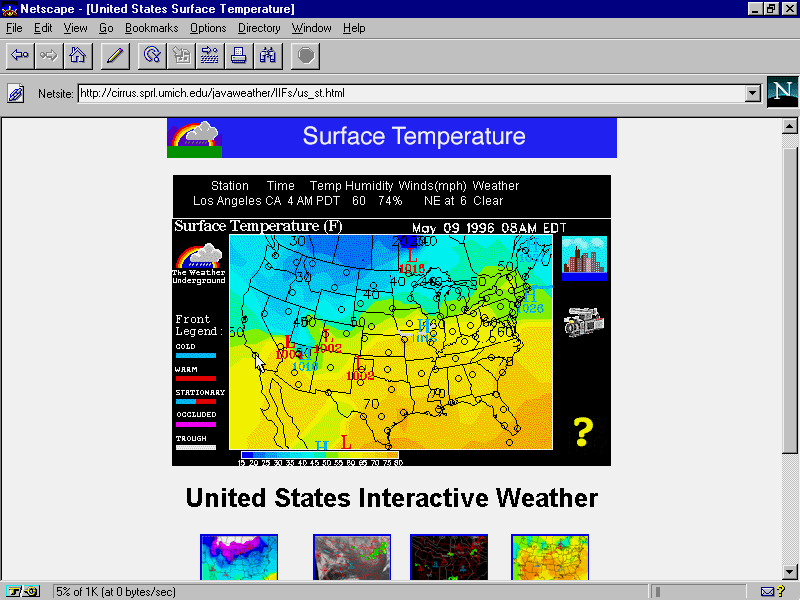 Take for example the Blue Skies Weather Underground, operated by the University of Michigan. (See Figure 14.2.) This site represents one of the best current examples of the incredible interactive capabilities that Java brings to the World Wide Web. The Weather maps and the various gadgets surrounding it in Figure 14.2 are all part of a single Java applet, which enables you to view the current weather report for major cities by highlighting them with the cursor. In addition, by clicking various regions of the map, you can zoom in for a close-up look at individual weather patterns, or, alternatively, view a movie of the weather pattern for the past 24 hours.