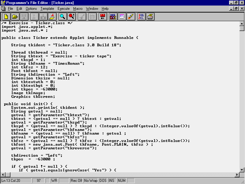 After choosing your editor, create a new directory to hold your Java applets. Start the editor and create a new file called Ticker.java. (Be sure to include the capital T because Java is very case specific.)