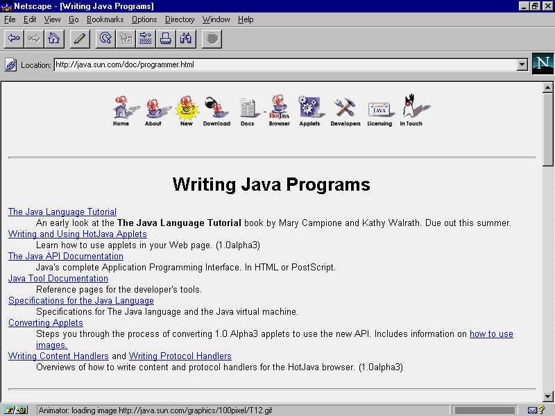 As a result of this stabilization, some very good tutorial documents, including the entire Java 1.0 API specification, are available online from Sun's Java Web site. To view any of this documentation or download a copy in either postscript or HTML form, point your Web browser to http://java.sun.com/doc/programmer.html, as shown in Figure 14.9.
