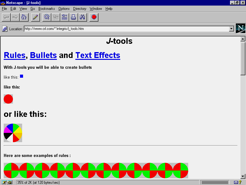 A quick exploration of the Gamelan site reveals various other sites that also offer classes you can incorporate into your own Web pages. Take, for example, the J_tools site shown in Figure 14.11. This collection includes applets that display animated bullets, multicolored wavy text, and different types of horizontal rules. To find out more about how you can use these applets in your own pages, take a look at http://www.crl.com/~integris/j_tools.htm.
