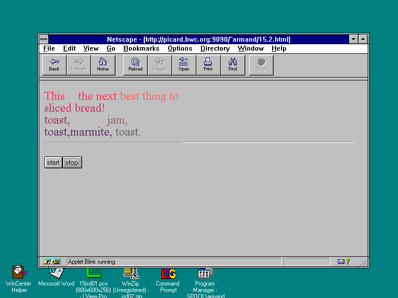 <applet code="Blink.class" name="Blink" width=300 height=100> <param name=lbl value="This is the next best thing to sliced bread! Toast, toast, toast, butter, jam, toast, marmite, toast."> <param name=speed value="4"> </applet> <HR> <form> <input type=button value="start" onClick="document.Blink.start()"> <input type=button value="stop" onClick="document.Blink.stop()"> </form>
