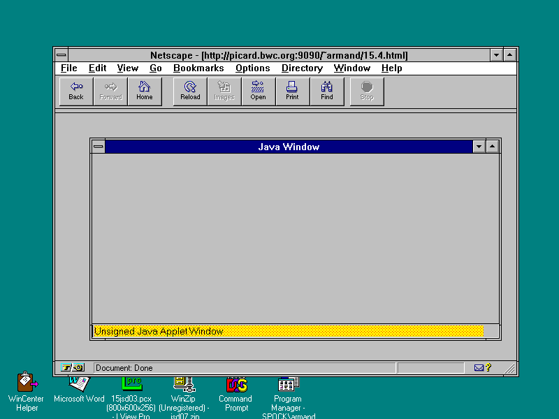 Notice that the windowObject variable is declared outside any method so that it's available in all the methods of the applet. In the init() method the handle to the top-level window object is created and in the start() method the eval() method is used to call JavaScript's alert() method. Notice the use of the backslash to escape the quotation marks in the call to the alert() method.