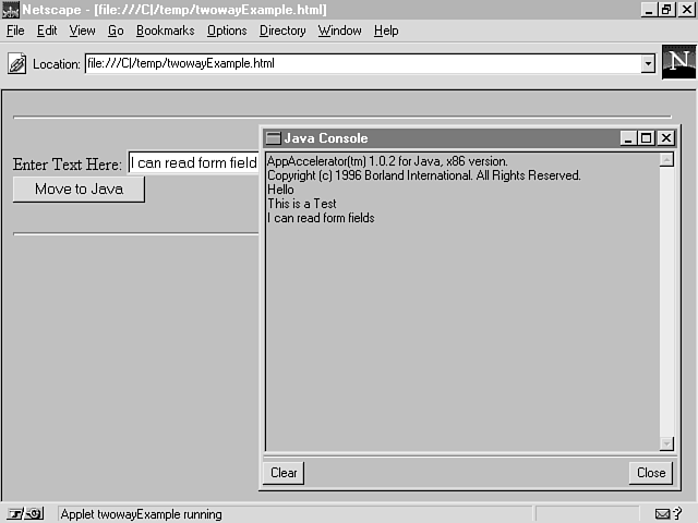 This applet assumes that it is being used in a page with a form called controlForm, with a text field called entryField. The applet initializes by reading the parameter output and setting up the font for output. Whenever the method displayField() is called, the output variable based on the content of the text field entryField and then this value is displayed in the Java console using System.out.println().