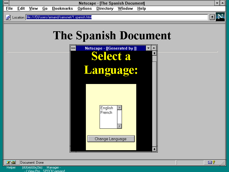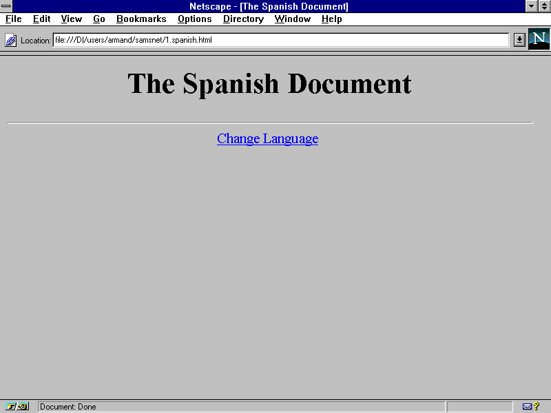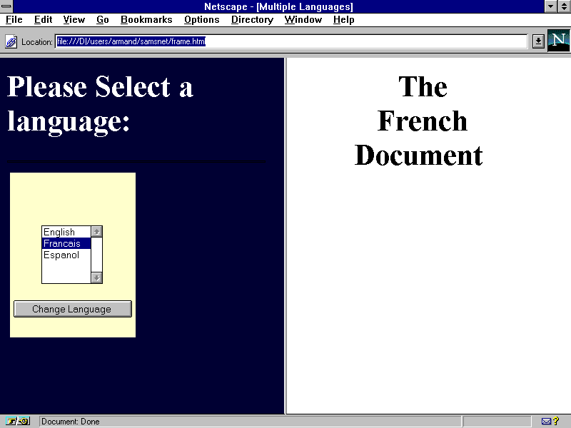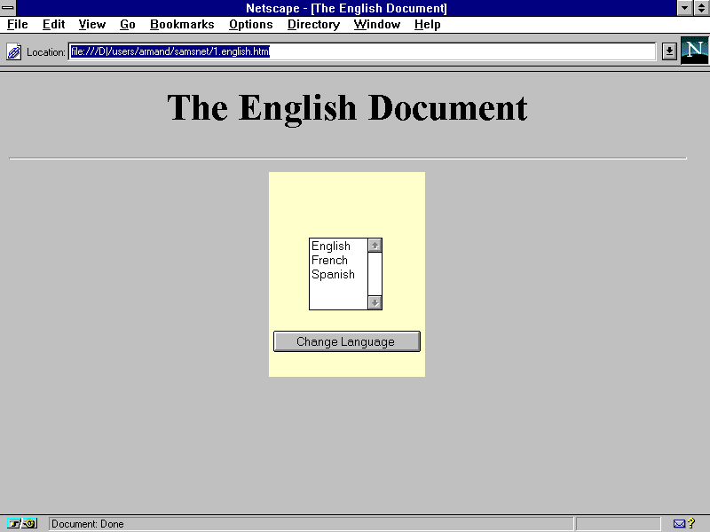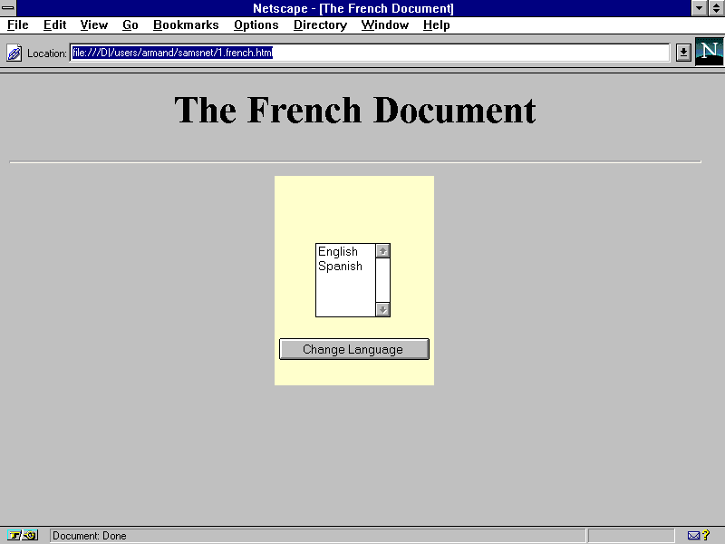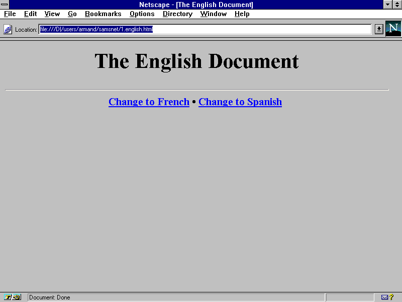 <BODY> <DIV ALIGN=CENTER> <H1>The English Document</H1> <HR> <STRONG> <A HREF="javascript:changeLanguage(1)">Change to French</A> • <A HREF="javascript:changeLanguage(2)">Change to Spanish</A> </STRONG> </DIV> </BODY>