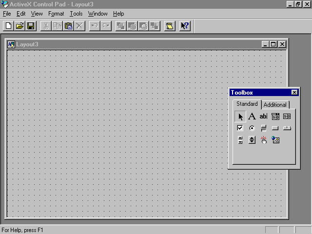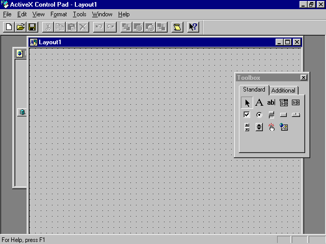 The Toolbox itself has two tabseach with a set of icons representing different controls that can be included in a layout. The two tabs are for "standard" and "additional" tools. Initially, the collection of controls in these sets may be limited. Additional controls can be added by right-clicking in the body of one of the tabs and selecting Additional Controls from the pop-up menu that appears.