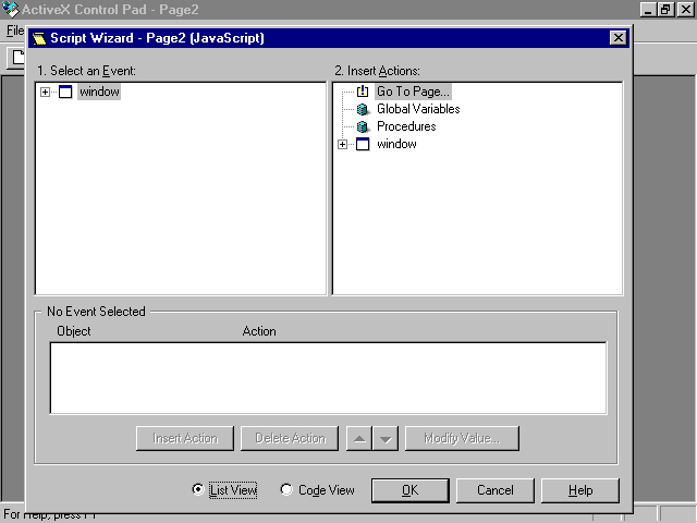 The underlying assumption of the Script Wizard is that it's designed to write scripts to associate with events and event handlers of objects available in a page. Scripting can be done entirely by selecting from lists and answering questions in dialog boxes, if desired.