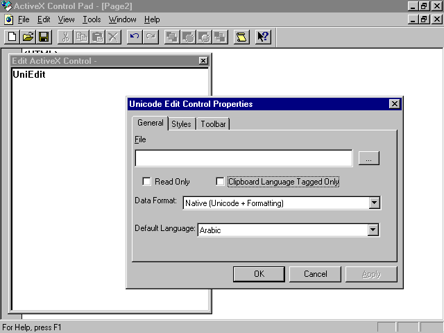 Once a control is inserted, its properties can be edited by right-clicking on the object and selecting Properties from the pop-up menu. This either opens the standard properties box used in the ActiveX Control Editor, or a custom properties box like the ones used by the UniCode Editor from Gamma Software.