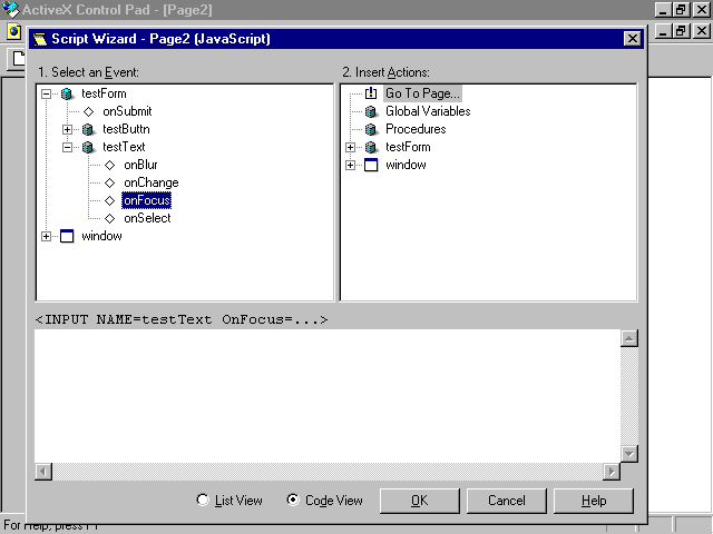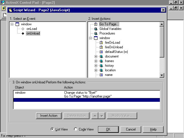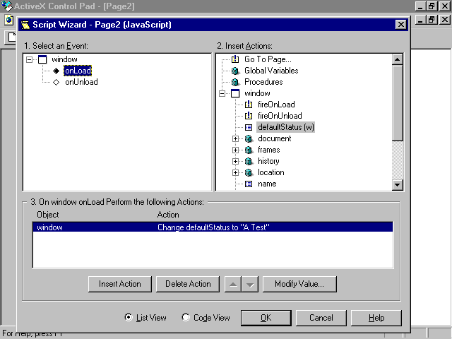 List View is well-suited to attaching simple actions or a series of actions to an event using a point-and-click interface. It prompts for most of the information it needs, such as values to be assigned to properties. The Code View, on the other hand, is designed for more detailed, extensive coding but provides an easy way to specify objects, methods, and properties without having to type their complete references. It allows for complete manual coding of a script or procedure if needed.