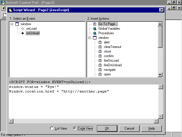 The List View can only create event handlers for the following actions: methods with no arguments, methods with the same number of arguments as the event handler, the special actions in the Script Wizard (which are discussed later in this chapter), and assigning values to properties or global variables. Anything beyond this needs to be done in the Code View.
