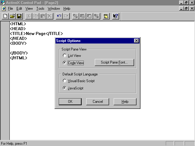 The Script Wizard can be used to create both VBScript and JavaScript scripts. The scripting language used by the Script Wizard is specified before invoking the Script Wizard. From the ActiveX Control Pad, select the Tools menu, select the Options menu, and then select Script .... This opens the Script Options window like the one shown in Figure 25.18. The window can be used to set the default view, the default scripting language and the font used by the Script Wizard.