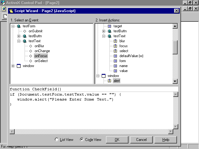 Now that the event is selected, you can script its action. In this case, the action is simple: the CheckField function created earlier in this chapter. All you need to do is double-click on CheckField in the event list and it appears in the script. This can be done in the Code View or the List View.
