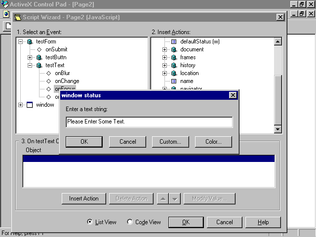 The List View is useful for attaching multiple simple actions to an event. For instance, after selecting CheckField from the action list, the same message could be displayed in the status bar by double-clicking on the status property of the window object in the List View. The Script Wizard prompts for the value to be assigned to status when this is done in List View (see Figure 25.21).