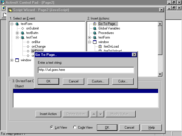 In the List View, double-clicking on the Go To Page ... action causes a prompt to be displayed, asking for the URL of the destination page, as shown in Figure 25.22.
